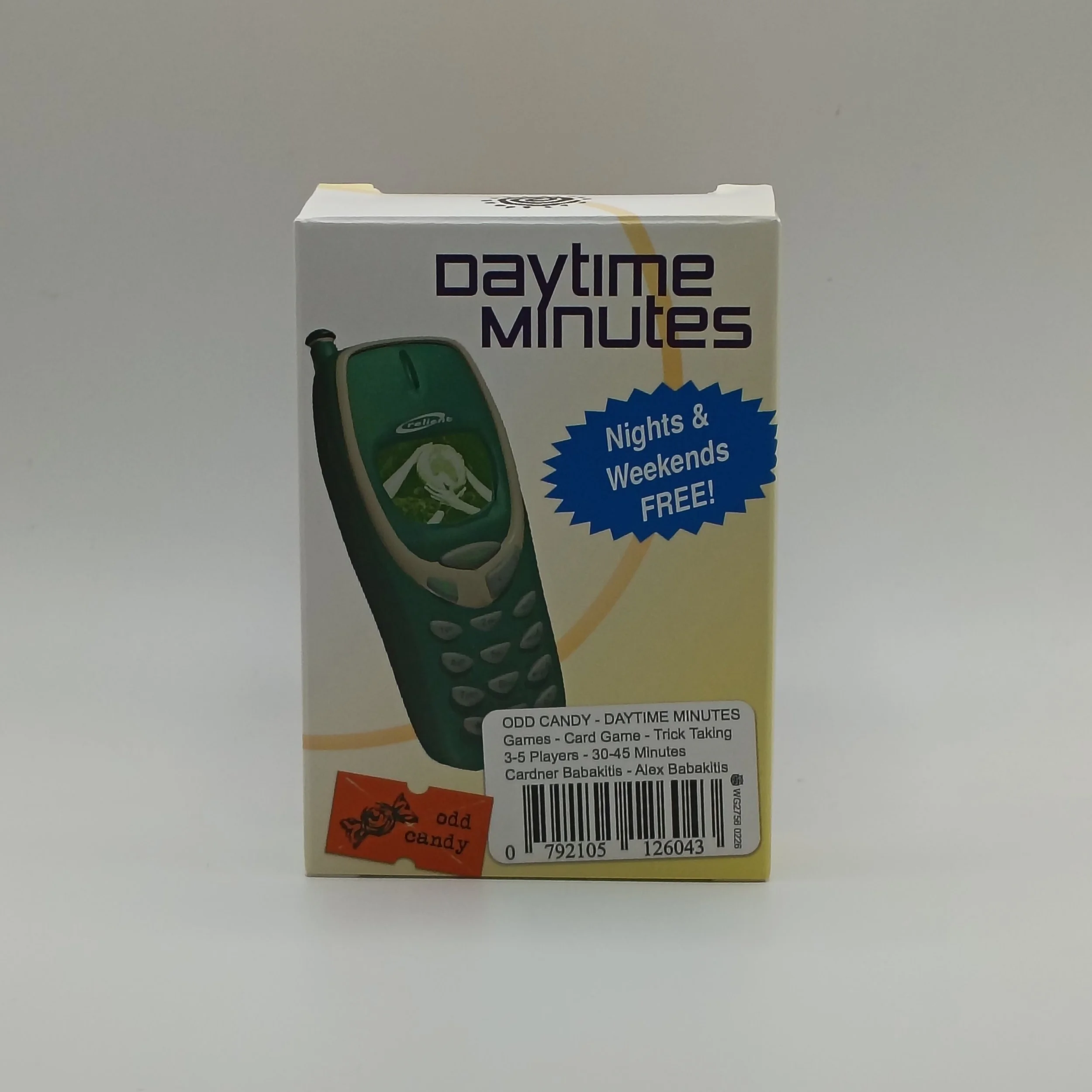 Daytime Minutes is a might-follow trick-taking game. Up to two different suits can be played into a trick, and the winner of each suit collects all cards of that suit. Players want to collect minutes on cards to try to get as close as possible to the plan limit without going over. If someone goes over, they incur overage charges and lose a point! But the player who captured the fewest minutes also loses a point. Each third trick is an evening call, and all cards played into the trick are discarded.