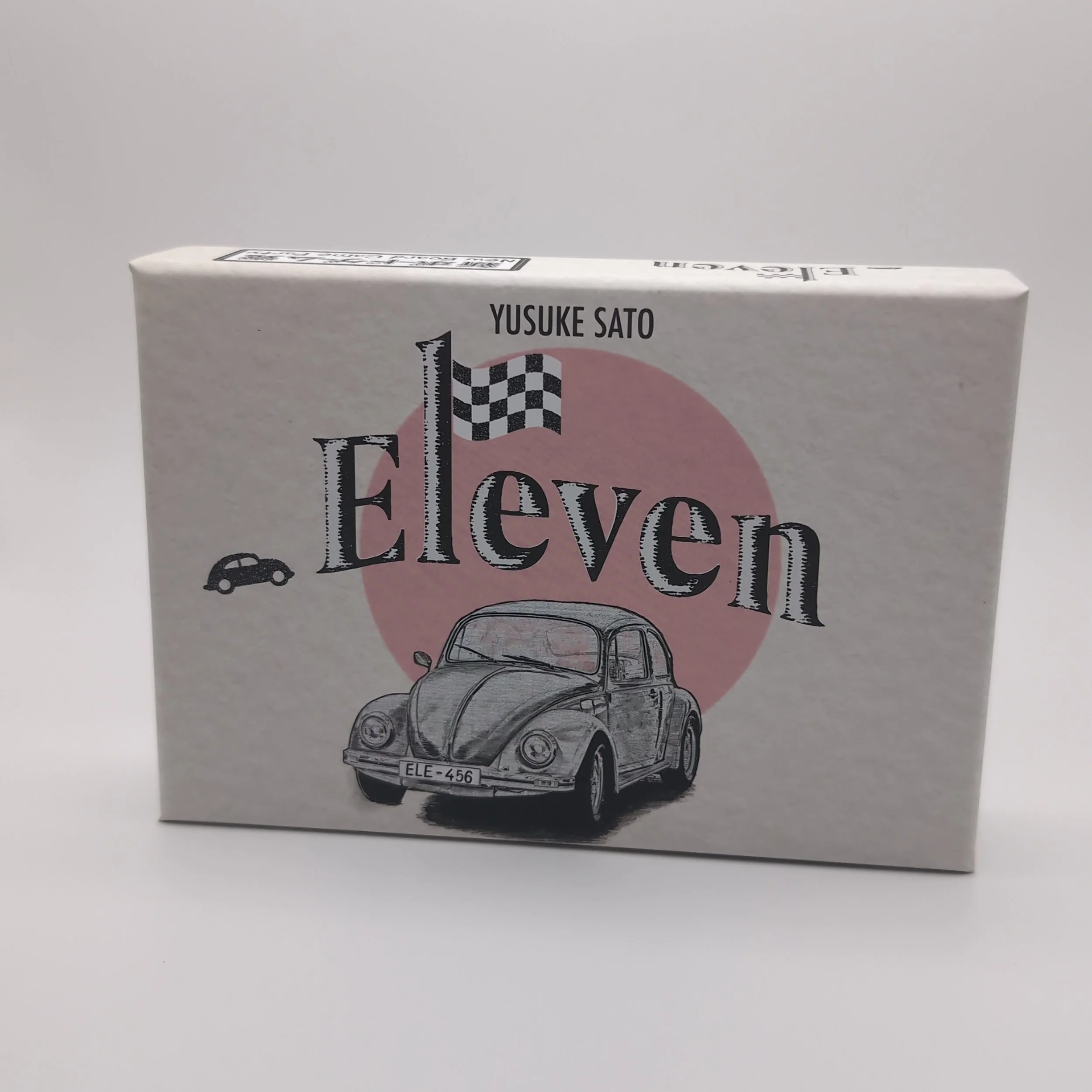 Eleven is a shedding card game from Japan. The game is played by making a sequence of cards with numbers on them to reduce the number of cards in your hand. The cards come in five different colours, and you draw as many cards as the number of colours in the sequence number you have played. In other words, you can reduce the number of cards in your hand by making a sequence of cards of the same colour as far as possible. When the hand is reduced to one card, it is revealed, the number is scored and the game continues by drawing the same number of cards as the number. The player who scores a total of 11 points wins the game. æ°åã®æãããã«ã¼ãã§é£çªãä½ããææãæ¸ããã¦ããã²ã¼ã ã§ããã«ã¼ãã¯5種é¡ã®è²ããããåºããé£çªã®ä¸ã«å«ã¾ããè²ã®æ°ã ãã«ã¼ããå¼ãã¾ããã¤ã¾ãããªãã¹ãåãè²ã§é£çªãä½ã£ãæ¹ãã«ã¼ããããããæ¸ãããã¨ãã§ãã¾ããææãï¼æã«ãªã£ããå ¬éãããã®æ°åãå¾ç¹ã«ãªãããã®æ°åã¨åãææ°ã®ã«ã¼ããå¼ãã¦ã²ã¼ã ãç¶ãã¾ããåè¨ã§ï¼ï¼ç¹ç²å¾ãããã¬ã¤ã¤ã¼ã®åå©ã§ãã --description by publisher