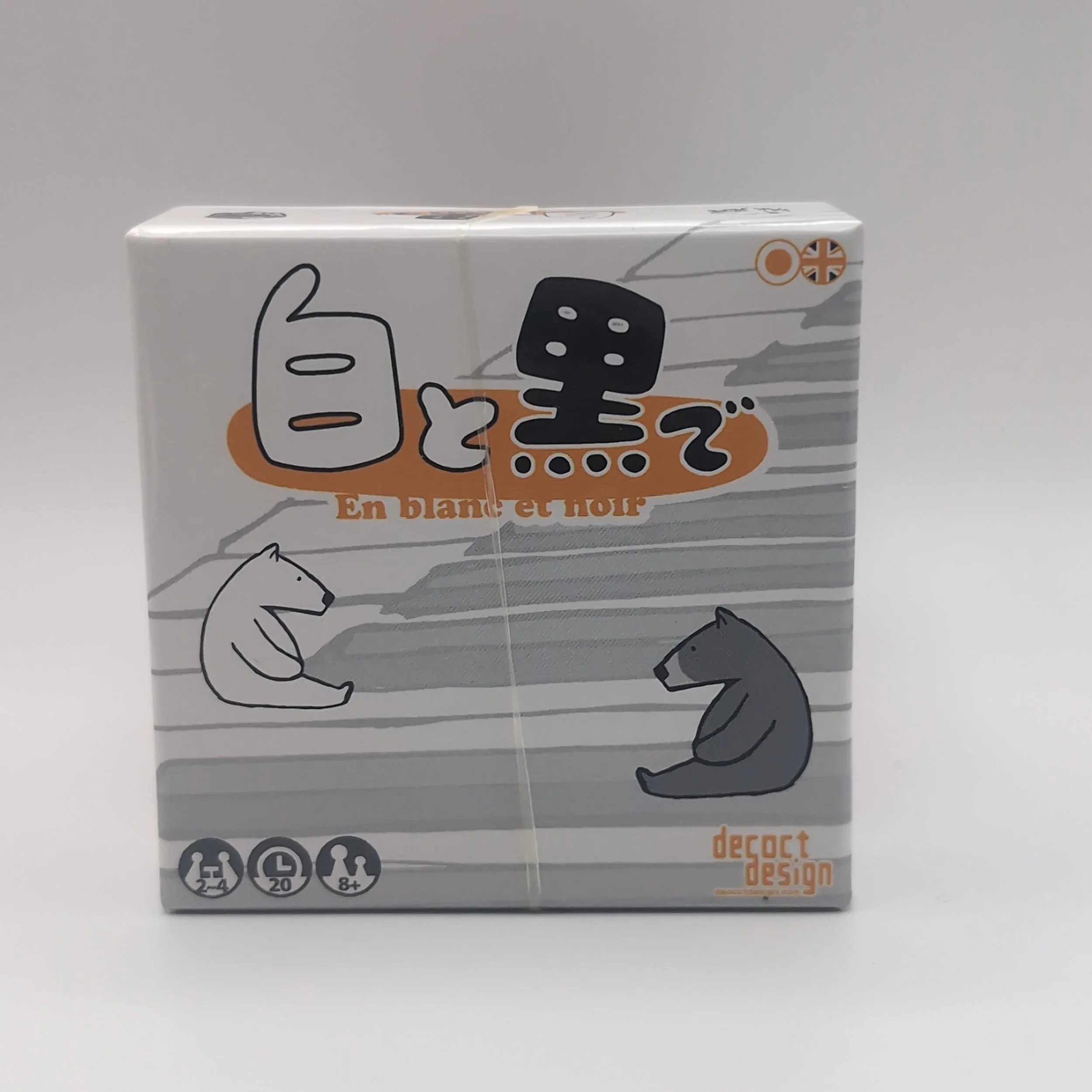 白と黒で ("En Blanc et Noir") is a pattern matching card game with a deck of black or white cards, each with a pattern on the face. On their turn players take two actions, either drawing a card, playing a card face down onto the "map", or playing a card in front of them face up that has a pattern matching the map for points. The game ends at the end of the turn that the last card is drawn. Players add up the cards played in front of them, minus the cards left in their hands, plus a bonus for certain cards matching the color found the most in the map, and the highest total wins. Not to be confused with 白と黒でトリテ (Trick-Taking in Black and White), a very similar looking and titled game from the same publisher.