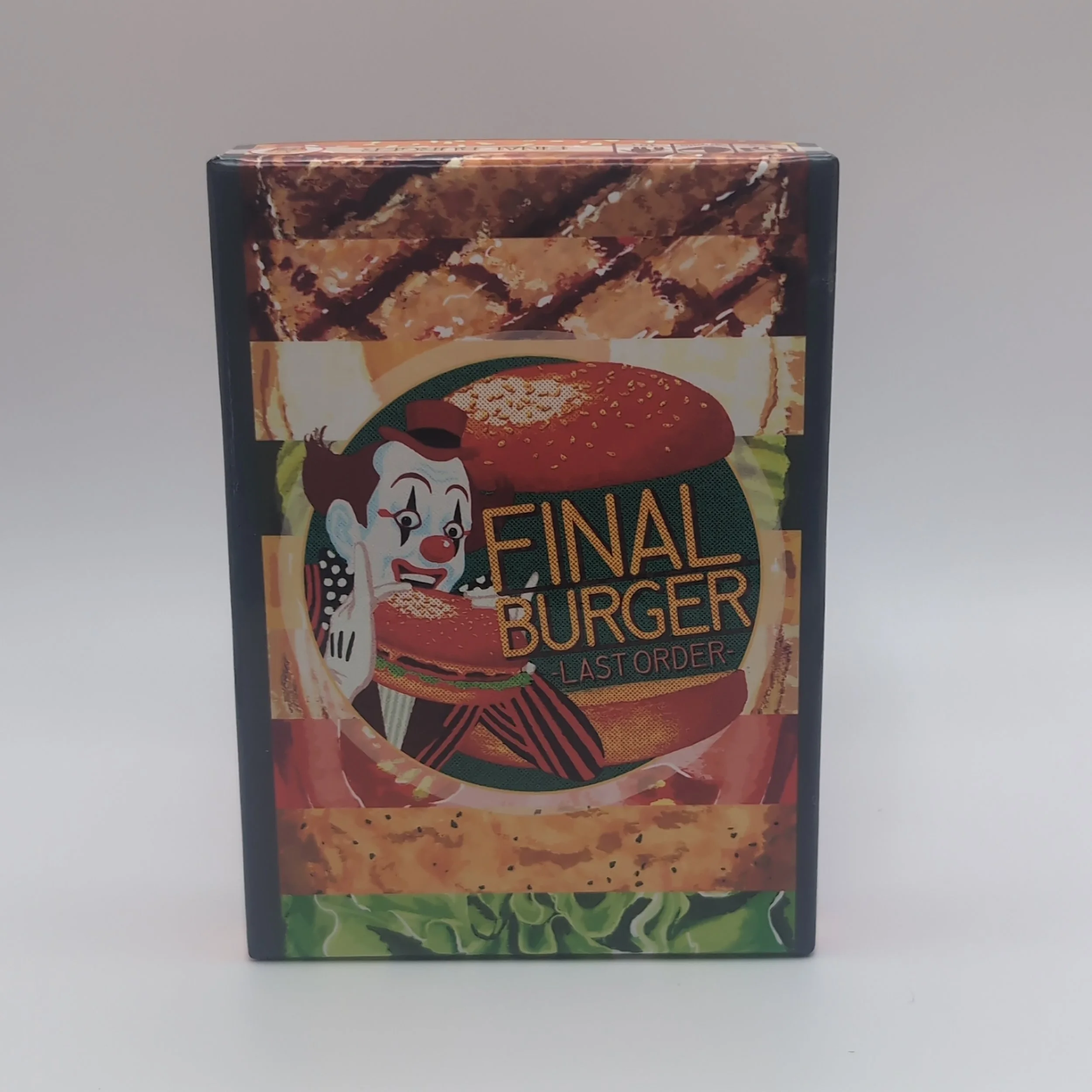 A trick-taking game, with bidding, where the cards earned from a trick are used to form hamburgers. The cards are round with a bun shown on the back. The suits are hamburger ingredients, such as a burger, lettuce, tomato, egg, cheese, etc. The pickle and french fry suits act as trump.