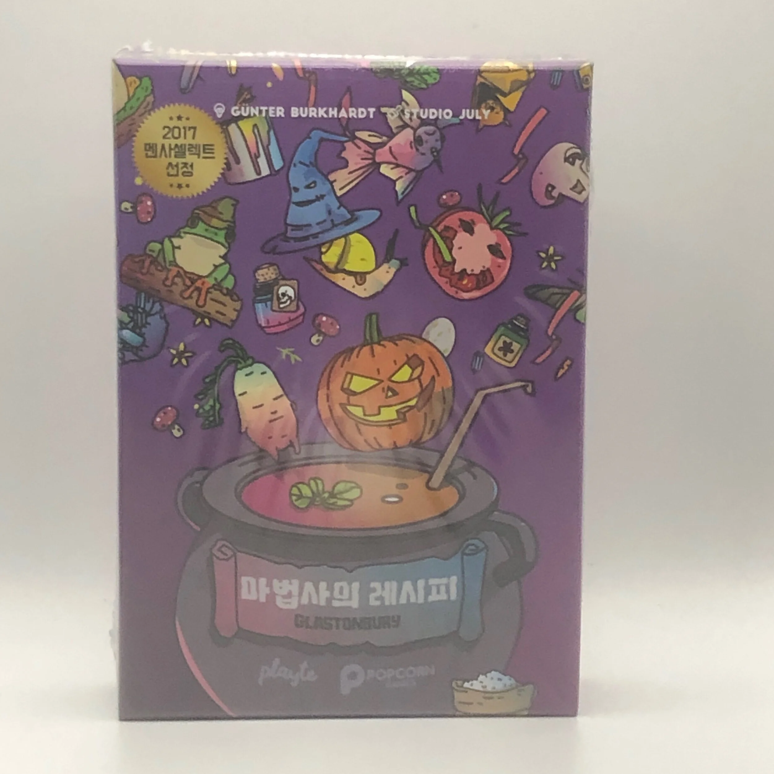 Glastonbury is a new edition of the 2001 release Kupferkessel Co. with slight changes to the game. Now the game can be played by up to four players instead of being strictly a two-player game. The game includes additional ingredient cards and new spell cards that allow special actions.