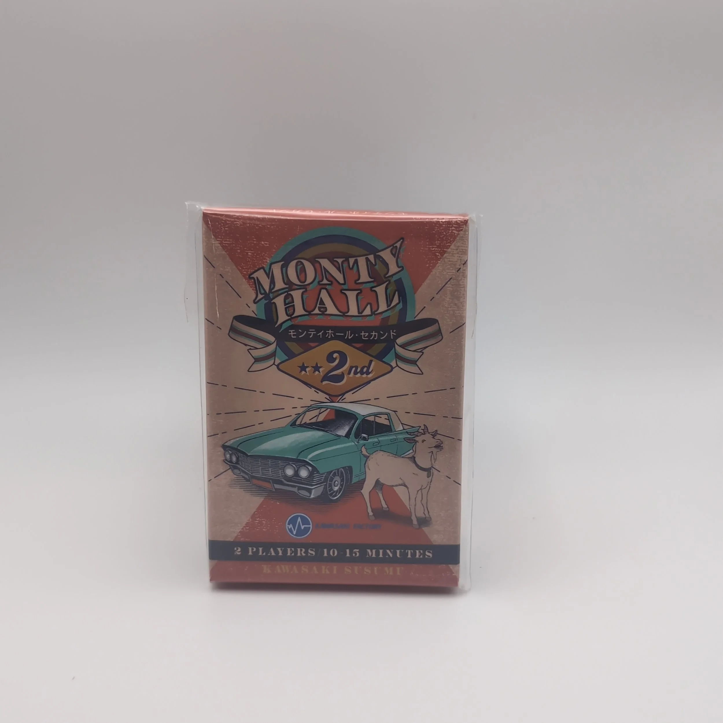 Monty Hall is a 2P game, where players draw cards or play cards, attempting to deduce whether the last card is a car or a goat. On your turn, you either play a card - with effects such as stealing a card, or arranging the top two cards of the deck - or draw the top card of the deck. The bottom card of the deck is either a goat or a car. If you draw the bottom card and it is a car, you win a point; if it is a goat, your opponent gets a point. The first person to get three points wins.