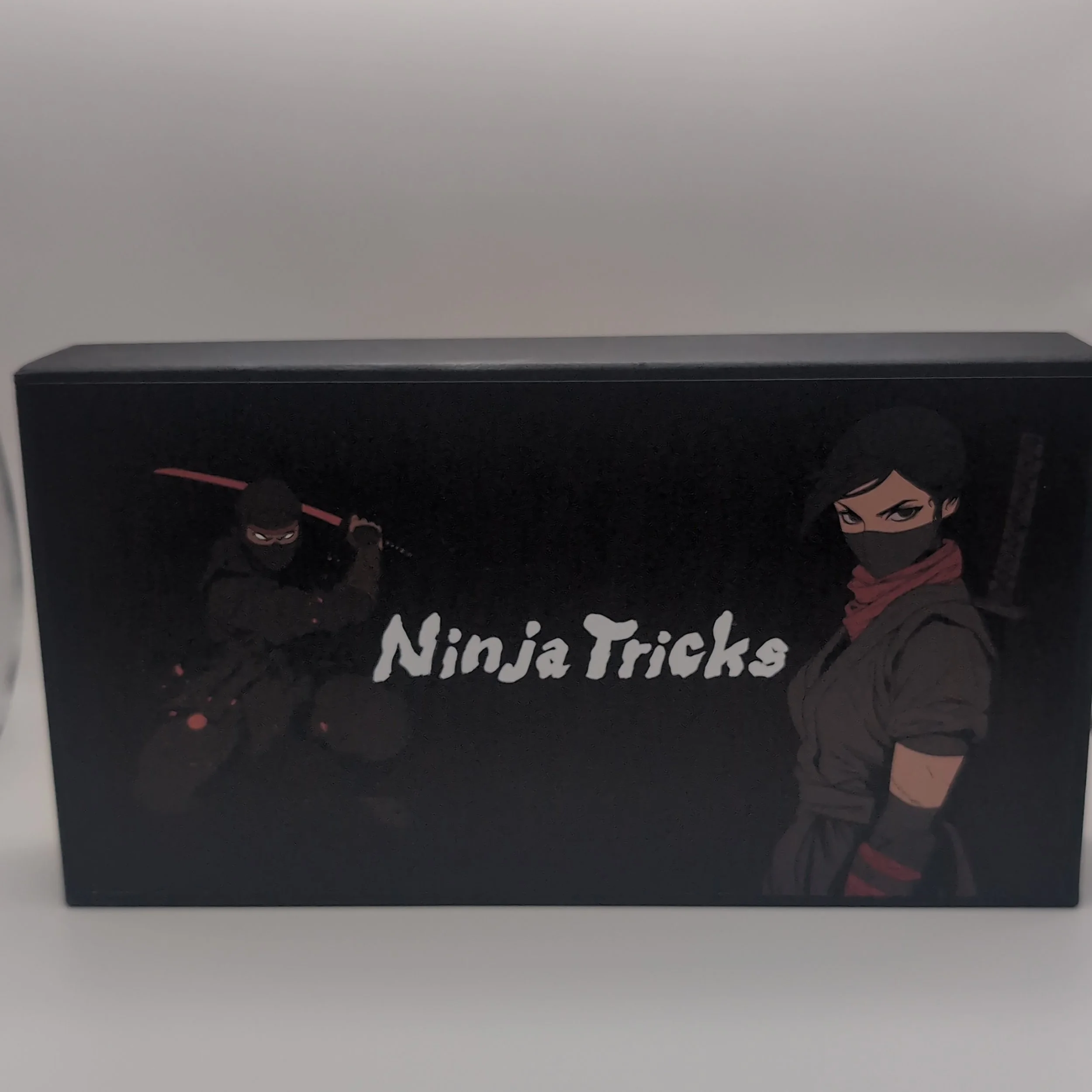 “Ninja Tricks” is a trick-taking game featuring a special “must-not-follow” rule: you may not play a card of the same suit as any suit that has already been played in the current trick. The goal of the game is to have the highest total score at the end of all rounds.