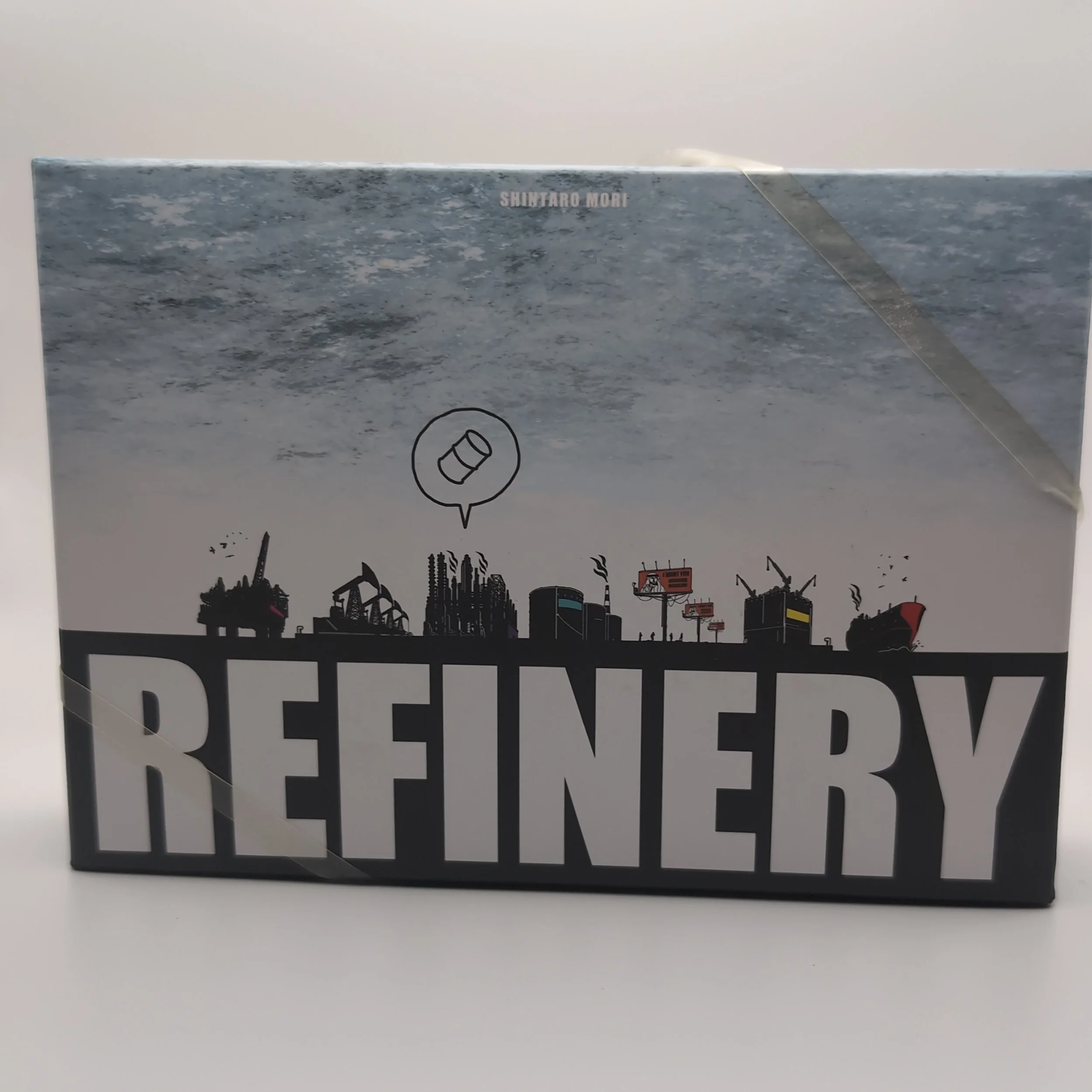 REFINERY is a Japanese game for 3 players only (though a 2p expansion / variant was subsequently released). You are the oil king. Today we dig oil, process it into various petroleum products at a refinery, and ship it all over the world. The game ends when someone builds their sixth building or there are no coins left in the stock. By then, it is the victory of the player who has accumulated more wealth than anyone else by building buildings or shipping various petroleum products. Wealth is measured in VP. Eight kinds of products are refined from rainbow-colored crude oil to control the world oil industry! I want to be an oil king. In this cut-throat 3-player petroleum industry game, manage your action selection to collect the most victory points at the end of the game. Balance the supply at your refineries to ensure you can maximize every action, and leverage the random board setup to cash in on the various buildings and factories made available. publisher's summary