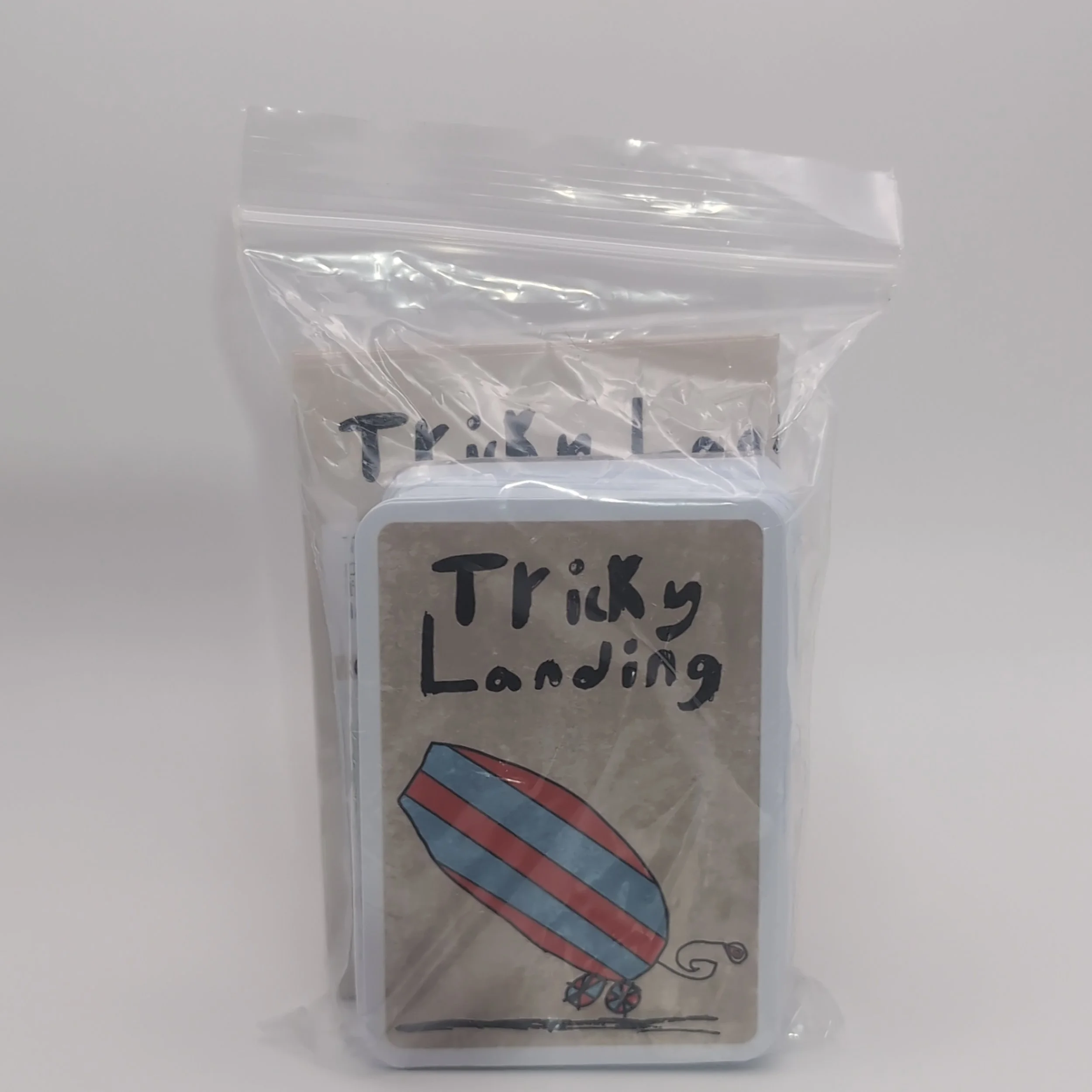 Tricky Landing is a dexterity trick-taking game where rather than play cards, players throw cards towards a target card! Make a successful landing for your card to be part of the trick, with the order in which cards land determining the lead suit. Miss the target and set the trump for the next trick, but beware as if more than one player misses the target you all take a penalty.