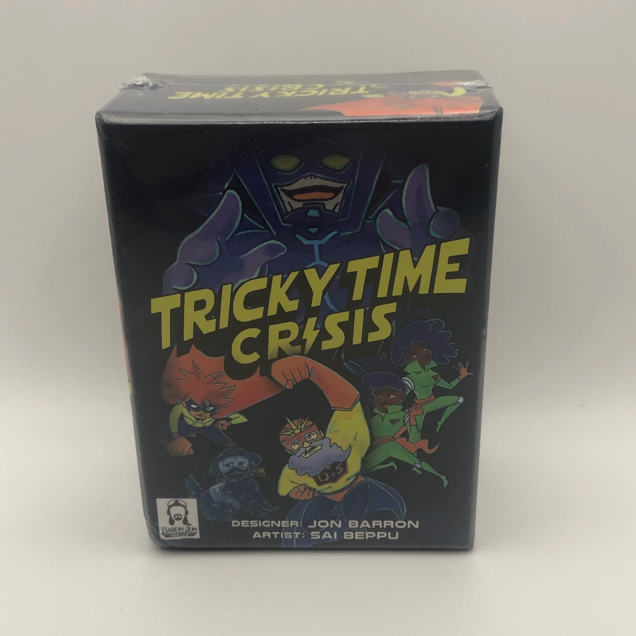 Tricky Time Crisis is a trick-taking game for 3-5 players with a Superhero and Time theme. It is a can't follow trick-taking game, where each player must play a different suit to the trick. If more that one card of the same suit would be played to a trick, two copies of the same person are in the same timeline and a paradox occurs with the hand ending early.