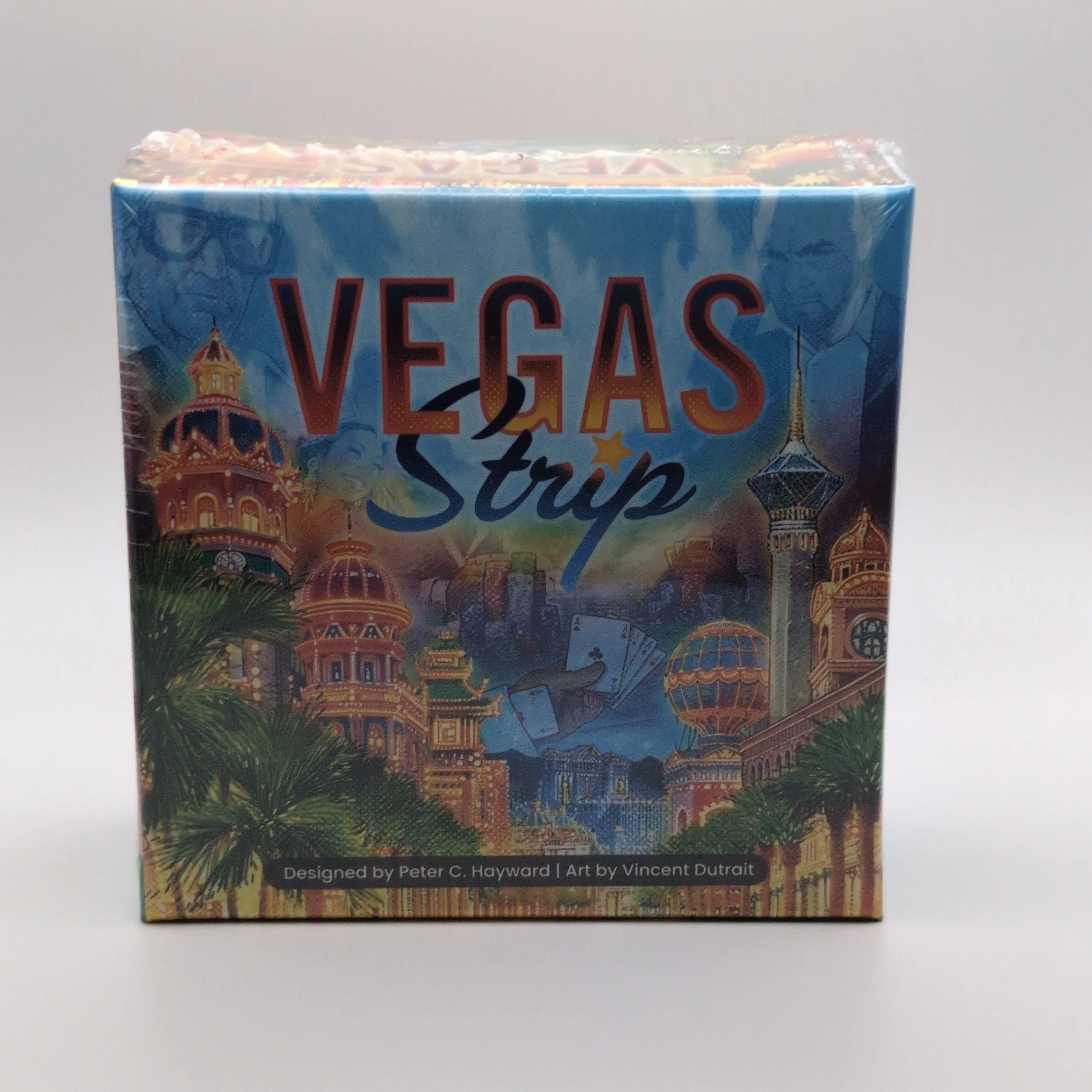 In this bluffing game, players have hidden information about which casinos are corrupt. Take turns playing money tiles (two 2’s, two 4’s, one 5, one six, one seven) into the different casinos. When scoring a corrupt casino, the highest bidder wins the jackpot (and everyone else gets nothing). In a non-corrupt casino, whoever has the most points there LOSES, and everyone else gets points equal to their bid. Players can’t place more than two tokens at a casino, and can’t place their highest token at the casino they know is corrupt. 20 unique casino power cards change up the formula every game. Take a gamble to win big! —description from the publisher