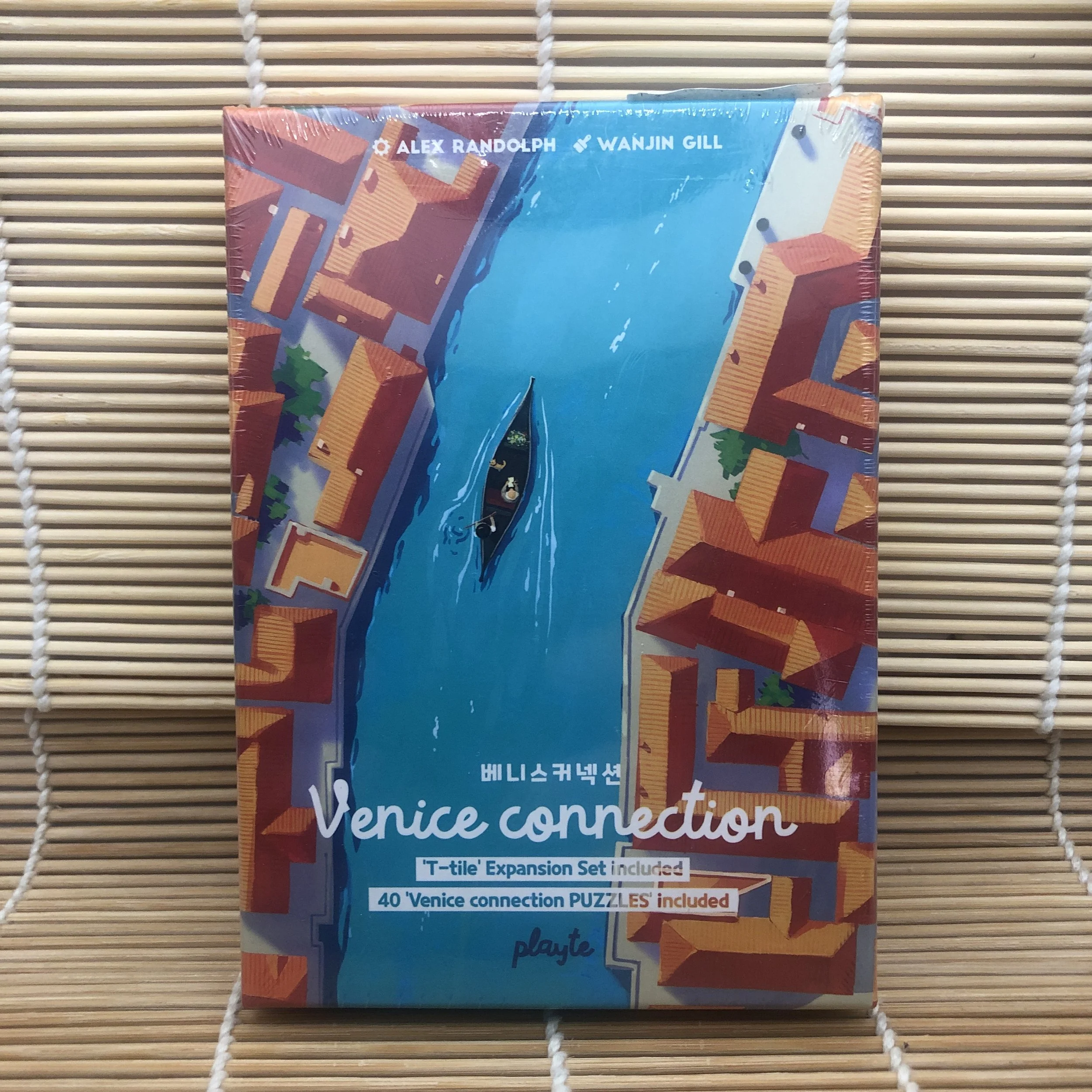 Venice Connection is a river-building / tile-placement game for two players. Your goal is to complete the canal in a loop. The game consists of 16 identical tiles, each with a straight section of canal on one side and a bend on the other. All the tiles are available for either player to use, and on a turn you place 1-3 tiles connected in a straight line adjacent to at least one other tile already in play (except on the first turn when you just place these tiles on the table).